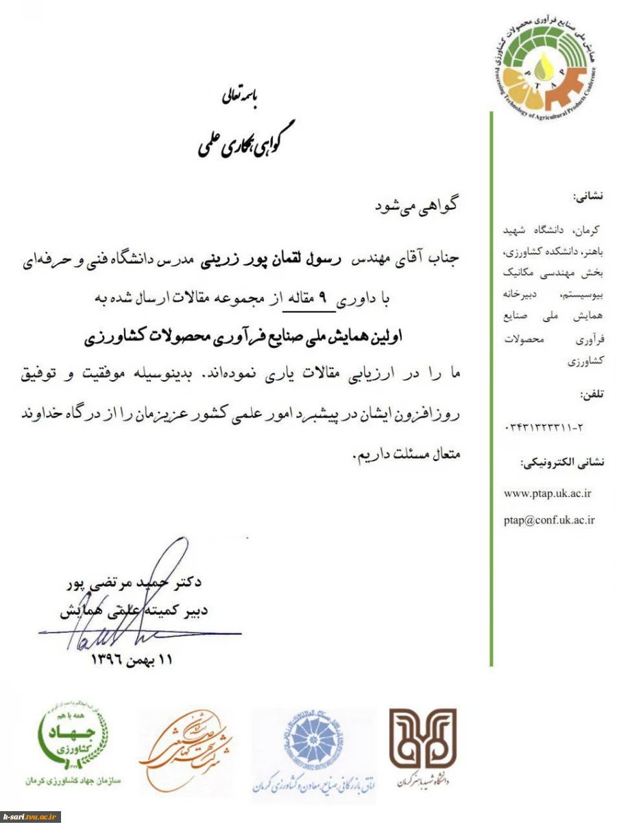 امتیاز دهید : عضویت مهندس رسول لقمانپور زرینی مدرس دانشگاه فنی و حرفه ای در کمیته علمی و داوری همایش ملی صنایع فرآوری محصولات کشاورزی دانشگاه شهید باهنر کرمان 2 سهشنبه 17 بهمن 1396 ساعت 12:06