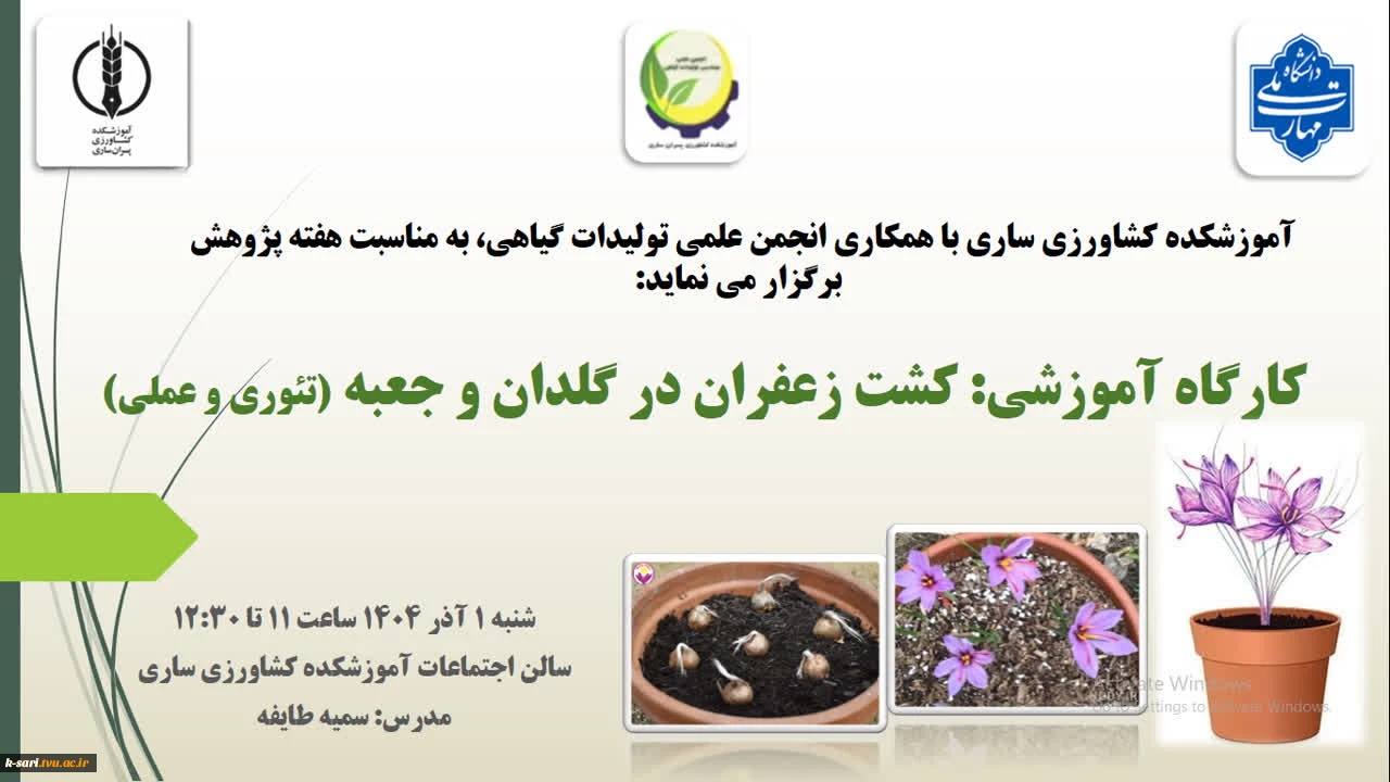 امتیاز دهید : کارگاه آموزشی کشت زعفران در گلدان و جعبه در سالن اجتماعات آموزشکده کشاورزی ساری 2 شنبه 1 آذر 1404 ساعت 9:30